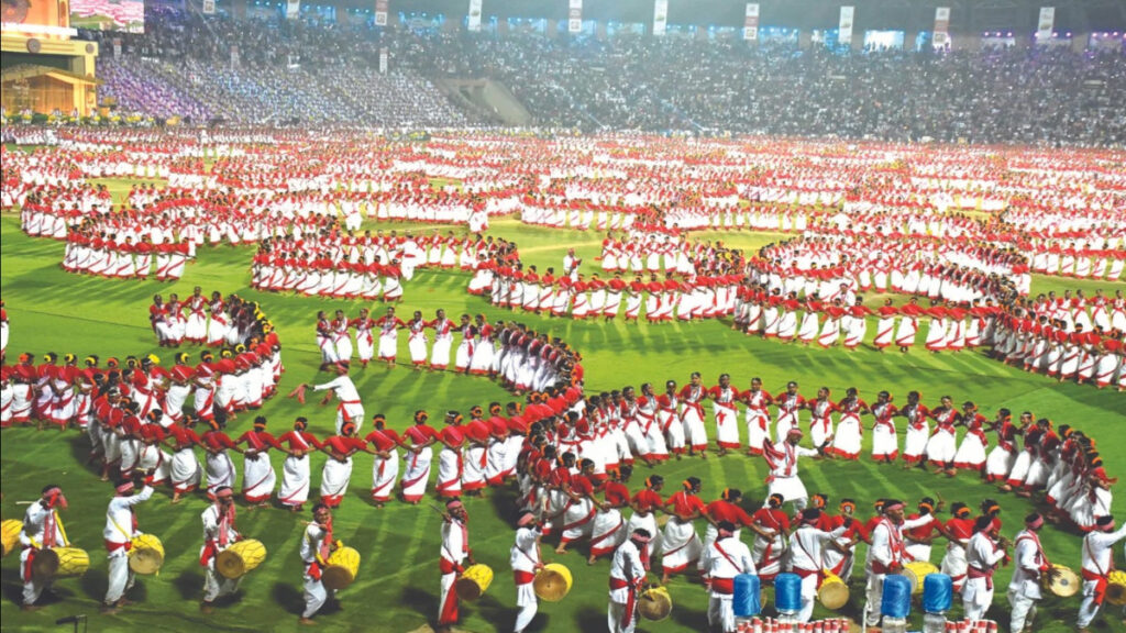 पिछले साल जून में लगातार तीसरी बार प्रधानमंत्री बनने के बाद राज्य की अपनी पहली यात्रा पर मोदी का सरुसजाई स्टेडियम में जोरदार स्वागत किया गया और स्टेडियम में ढोल की ध्वनि और “ऐतिहासिक” झुमुर नृत्य के प्रतिभागियों की लयबद्ध ताल से गूंज उठा.