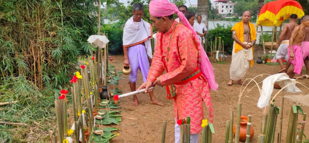 जिस क्षेत्र में अनुष्ठान किए जाते हैं, उसके आसपास बांस के डंडों, केले के पत्तों और प्रतीकात्मक चीज़ों से एक घेरा बना दिया जाता है.