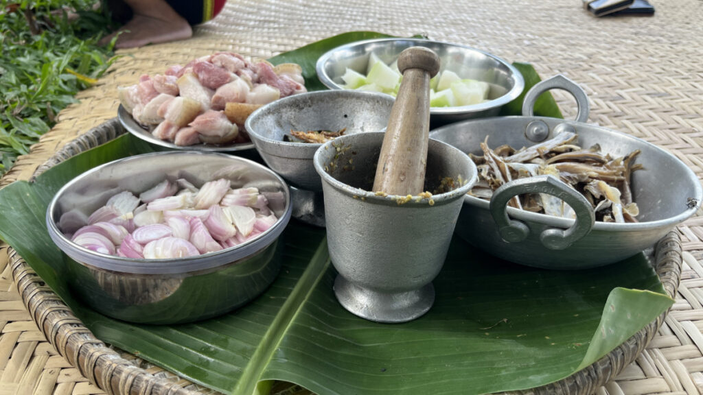 फिर इसमें स्थानीय देशी चिकन, पालक या दूसरी हरी सब्ज़ियाँ, लहसुन, अदरक, मिर्च पेस्ट, सरसों का तेल, और नमक डालकर पकाया जाता है.